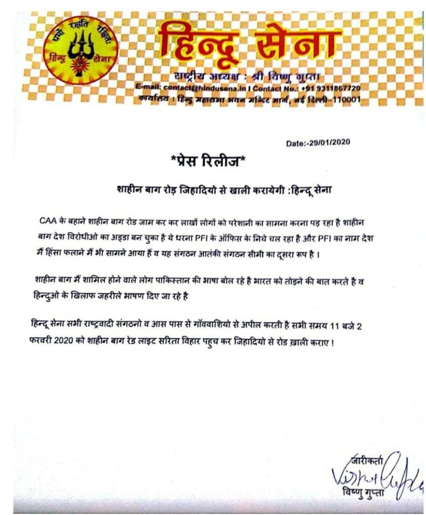 Right-wing fringe outfit Hindu Sena on Wednesday threatened to remove all the anti-Citizenship Amendment Act (CAA) protesters from Shaheen Bagh in Delhi. Hindu Sena, in a press release, said it would remove all the “Shaheen Bagh Jihadis” at 11 am on February 2, 2020. The Shaheen Bagh protest against the CAA, which has been going on for more than a month now, has become a flash-point of politics weeks ahead the Delhi Assembly election 2020. Allegations and counter-allegations have been exchanged between the Bharatiya Janata Party (BJP) and the Aam Aadmi Party (AAP) on this issue.