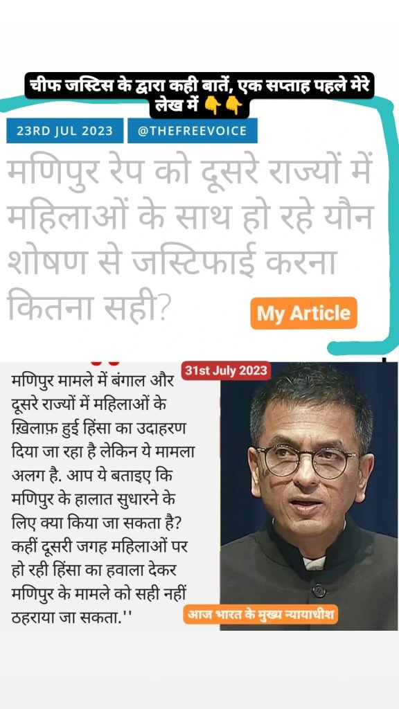 आज भारत के मुख्य न्यायाधीश जस्टिस डि. वाई चन्द्रचूर ने कहा कि दूसरे राज्यों में हो रहे महिला हिंसा से मणिपुर में हुए शर्मशार घटना को सही नहीं ठहराया जा सकता।