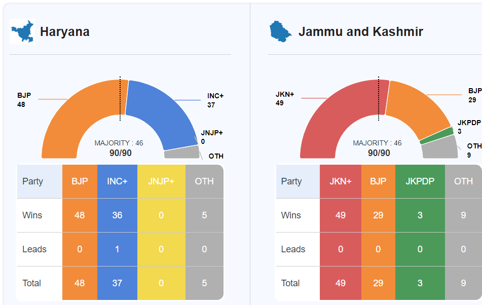 The election results for Haryana and Jammu & Kashmir were announced today, October 8, 2024. In Haryana, the Bharatiya Janata Party (BJP) secured a majority with 48 seats, marking a significant victory. In Jammu & Kashmir, the Congress-National Conference (NC) alliance emerged as the dominant force, sweeping key constituencies while independents also made a notable impact.