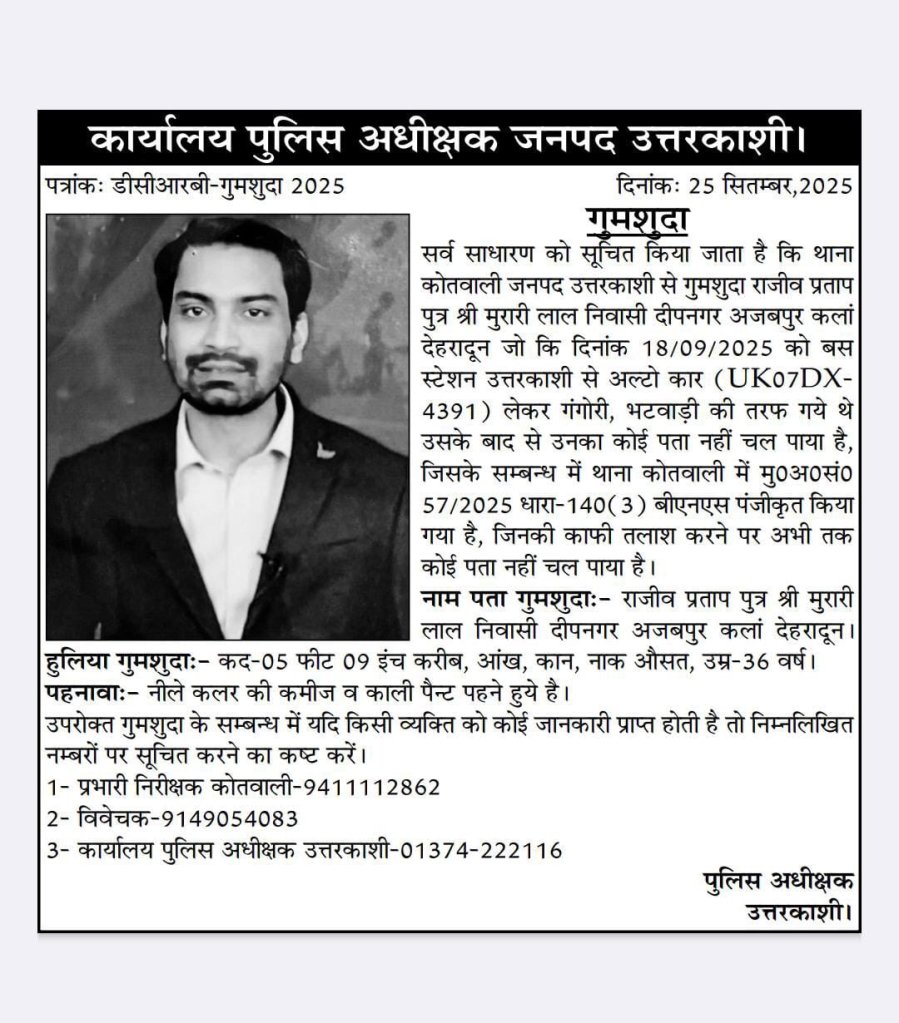 19 सितंबर को उनकी कार गंगौरी के पास भागीरथी नदी से बुरी तरह क्षतिग्रस्त हालत में मिली थी। कई दिनों की तलाश के बाद, रविवार को उनका शव नदी के जोशियारा बैराज से बरामद हुआ।