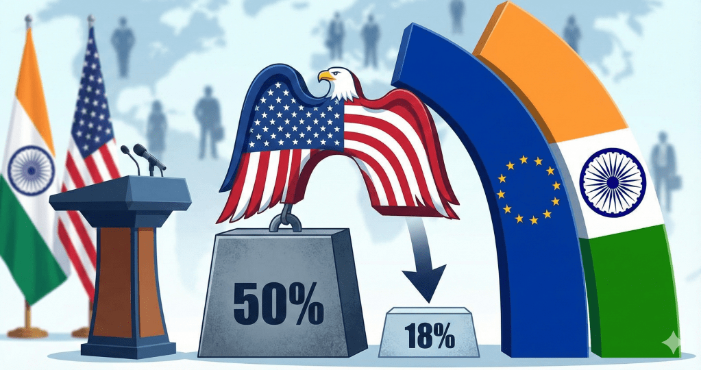 अमेरिका की इस अप्रत्याशित जल्दबाजी और नरम रुख के पीछे एक प्रमुख कारण भारत और यूरोपीय संघ (EU) के बीच बढ़ती रणनीतिक साझेदारी है। हाल ही में भारत और यूरोपीय संघ के बीच मुक्त व्यापार समझौते (FTA) पर हस्ताक्षर होने की खबर ने वाशिंगटन में खतरे की घंटी बजा दी थी। इस समझौते के बाद अमेरिका को यह डर सताने लगा था कि यदि उसने जल्द कदम नहीं उठाए, तो विशाल भारतीय बाजार में अमेरिकी कंपनियां पिछड़ जाएंगी और वहां यूरोपीय उत्पादों को प्राथमिकता मिलने लगेगी। भविष्य में होने वाले इसी भारी आर्थिक नुकसान के भय और ‘फोमो’ ने ट्रम्प प्रशासन को अपनी कड़ी शर्तों में ढील देने और टैरिफ घटाने के लिए विवश किया, ताकि वे भारत के साथ अपने व्यापारिक हितों को सुरक्षित रख सकें।