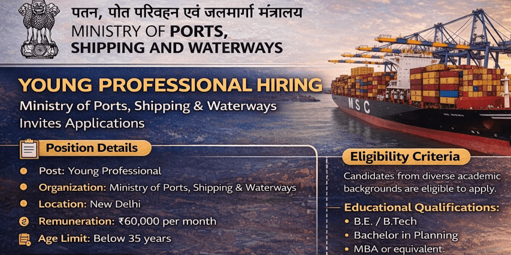 नई दिल्ली — भारत सरकार के पत्तन, पोत परिवहन और जलमार्ग मंत्रालय ने देश के प्रतिभाशाली युवाओं को अपनी रणनीतिक परियोजनाओं से जोड़ने के लिए यंग प्रोफेशनल (Young Professional) के पदों पर आवेदन आमंत्रित किए हैं। यह अवसर उन लोगों के लिए है जो भारत के समुद्री क्षेत्र (Maritime Sector) और राष्ट्रीय बुनियादी ढांचे (Infrastructure) के विकास में सीधे तौर पर अपना योगदान देना चाहते हैं।