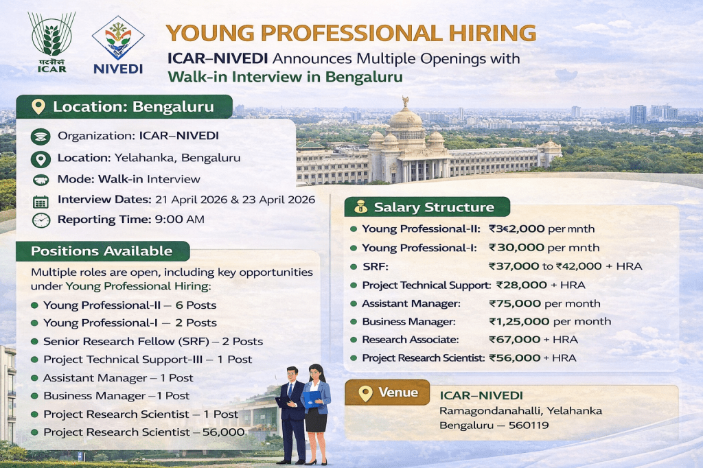 ICAR-NIVEDI द्वारा जारी विज्ञापन के अनुसार, यह भर्ती पूरी तरह संविदा (Contractual) आधारित है। लाइफ साइंस, डेटा साइंस और एग्रीकल्चर क्षेत्र के उम्मीदवारों के लिए यह एक शानदार अवसर है।